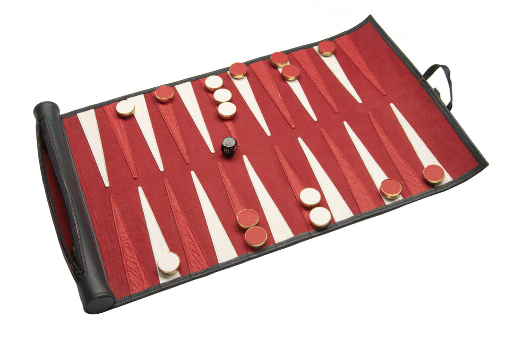 Unrolling to reveal contrasting red and white playing points, the Rigby Backgammon Set blends style with practicality, ensuring an immersive gaming experience wherever you go.